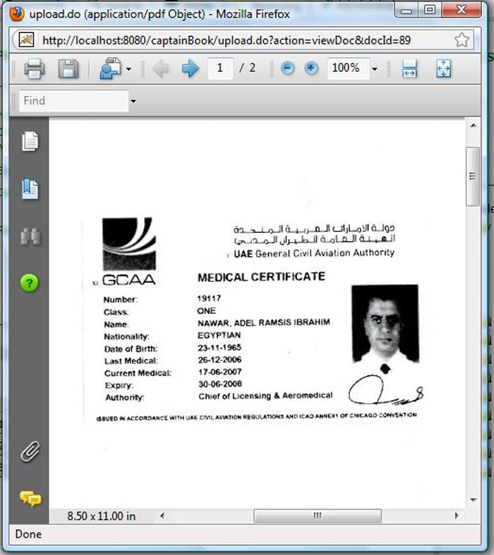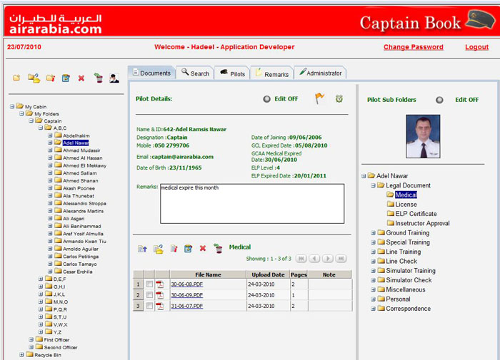 This page shows that each pilot has his folder which contains basic information like date of birth, date of joining, license expiration date..etc. Beside a free formatting field for remarks .